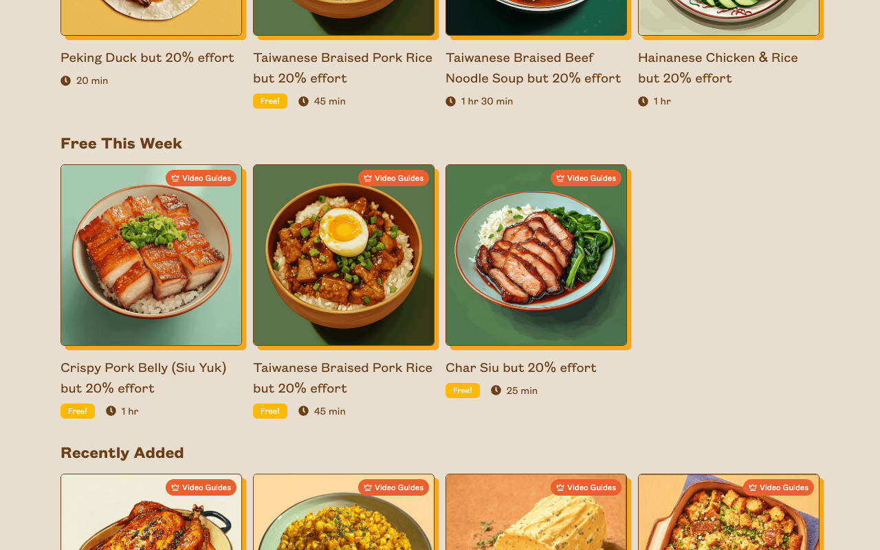 Each recipe card shows the dish image, title, cook time, and badges like "Free!" or "Video Guides" when applicable. Tap any card to open the full recipe detail page.