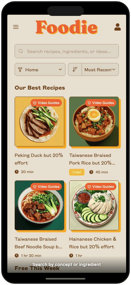 Concept-based search is what makes Foodie's search special. It understands the meaning behind your words, so "easy summer lunch" finds light, simple recipes even if those exact words aren't in the title.